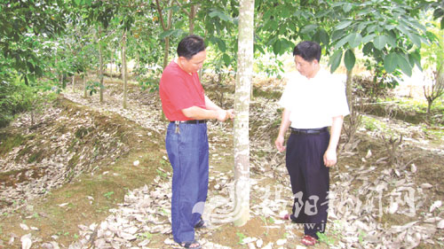 農(nóng)場領(lǐng)導在察看橡膠樹長勢情況。